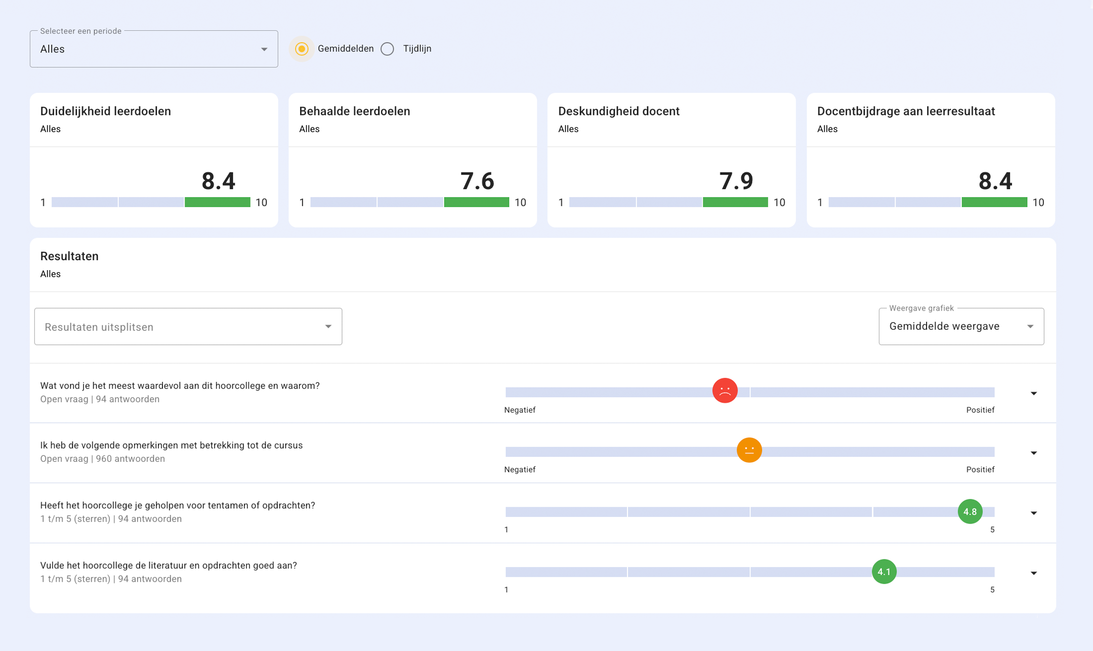 Meten is essentieel voor het verbeteren van processen, het versterken van beleid en het verhogen van tevredenheid binnen organisaties. Of het nu gaat om het waarborgen van sociale veiligheid, het monitoren van medewerkerstevredenheid, het evalueren van toetsresultaten of het verzamelen van feedback over docenten – Evalytics biedt een breed scala aan functionaliteiten die organisaties helpen om op een gestructureerde en doelgerichte manier te evalueren. Bekijk ze hier.
